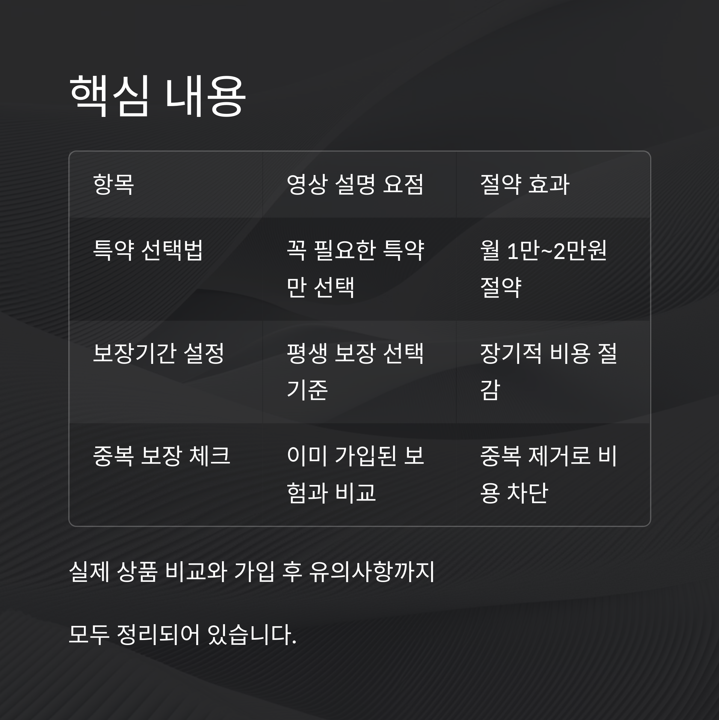 | 특약 선택법 | 꼭 필요한 특약만 선택 | 월 1만~2만원 절약 |
