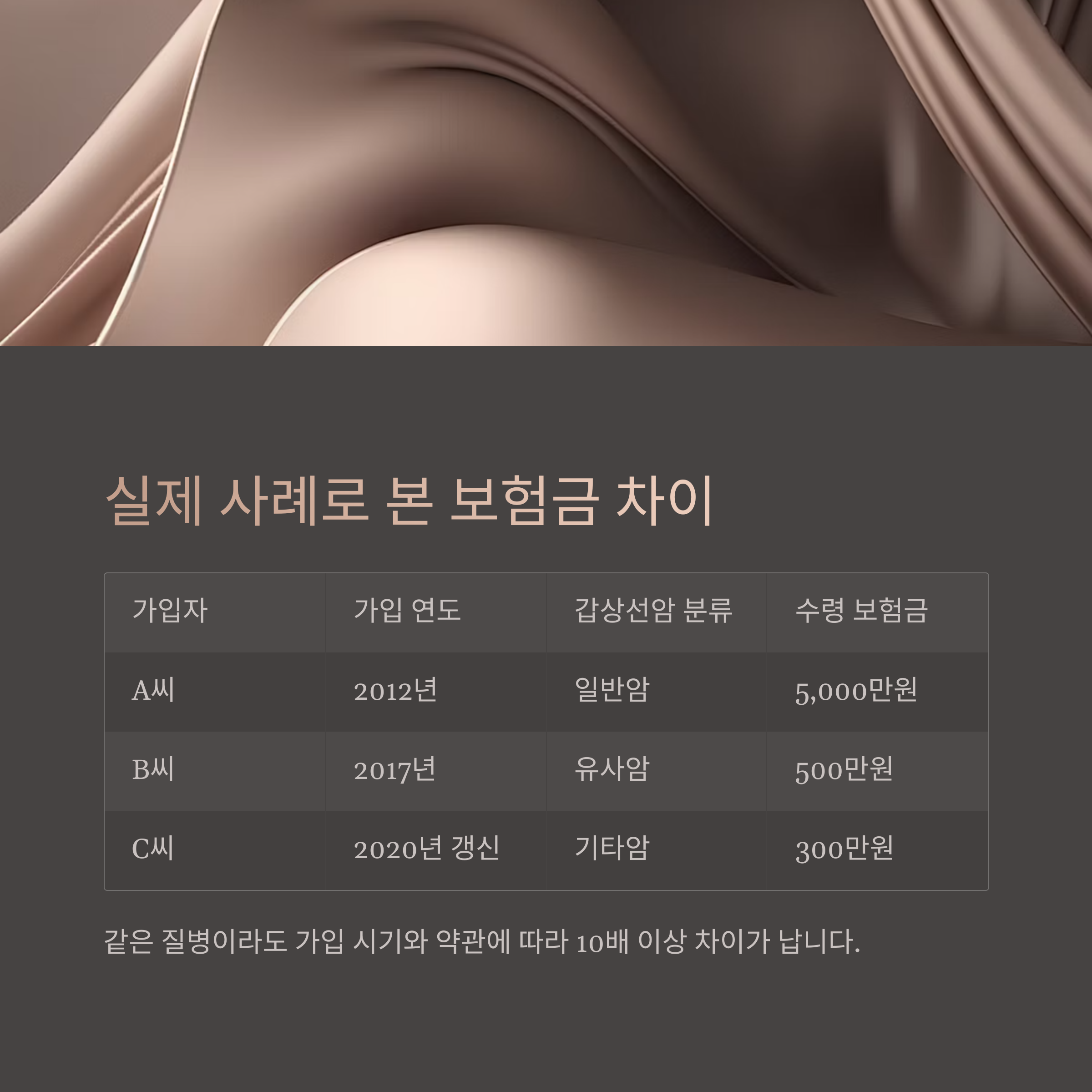 같은 질병이라도 가입 시기와 약관에 따라 10배 이상 차이가 납니다.