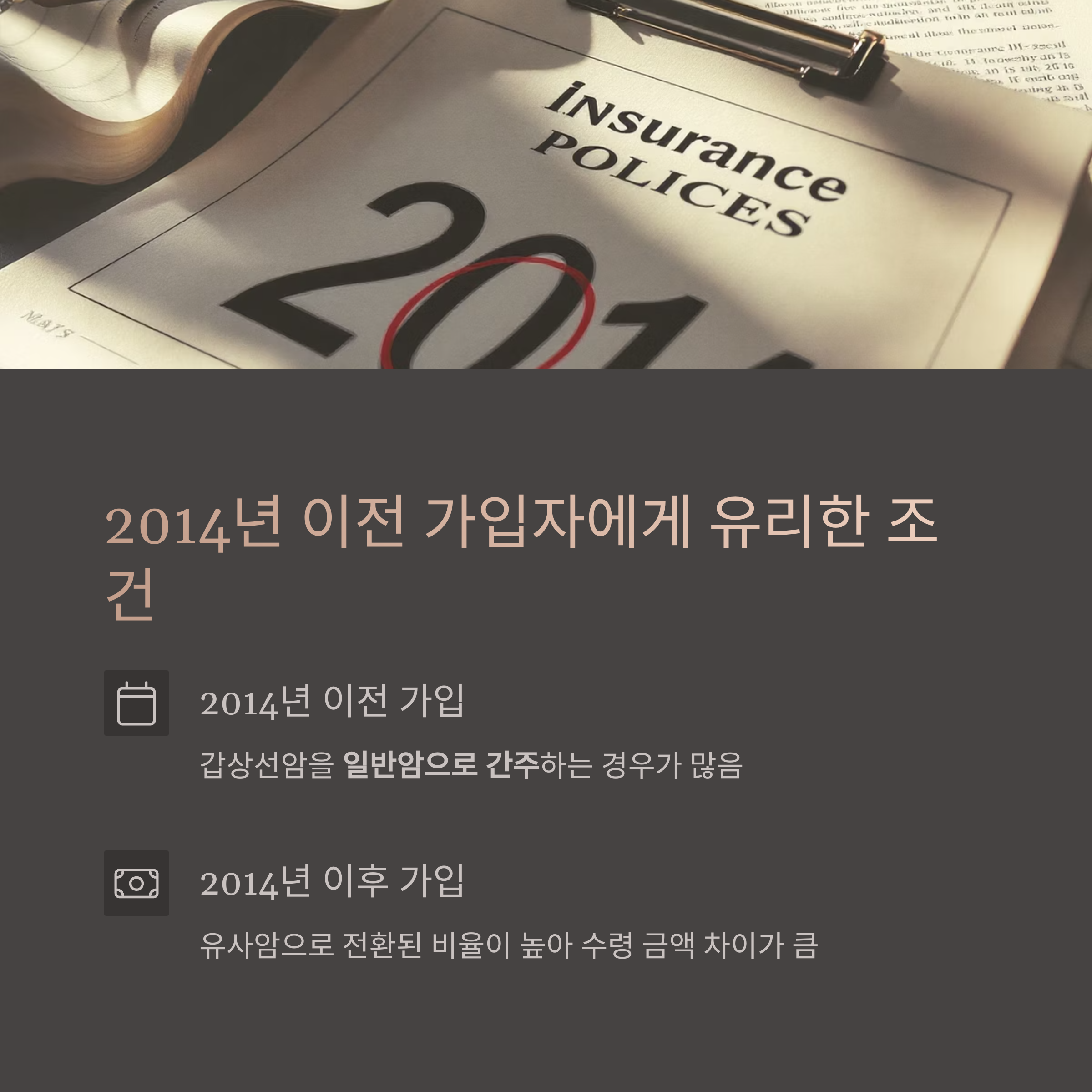 2014년 이전 가입한 상품 중 일부는 갑상선암을 일반암으로 간주하는 경우가 많습니다.