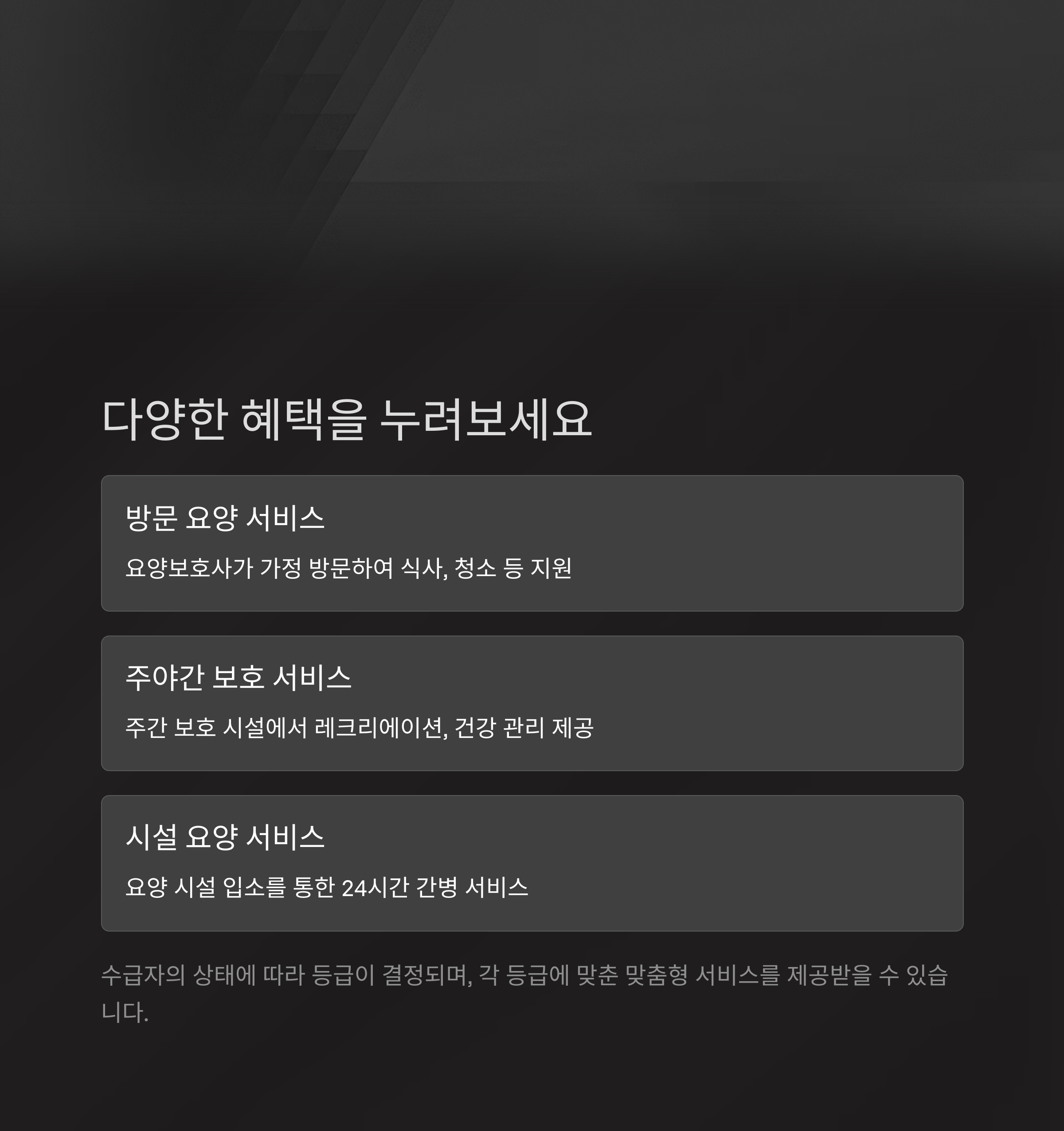 | 시설 요양 서비스 | 요양 시설 입소 | 24시간 간병 서비스 |