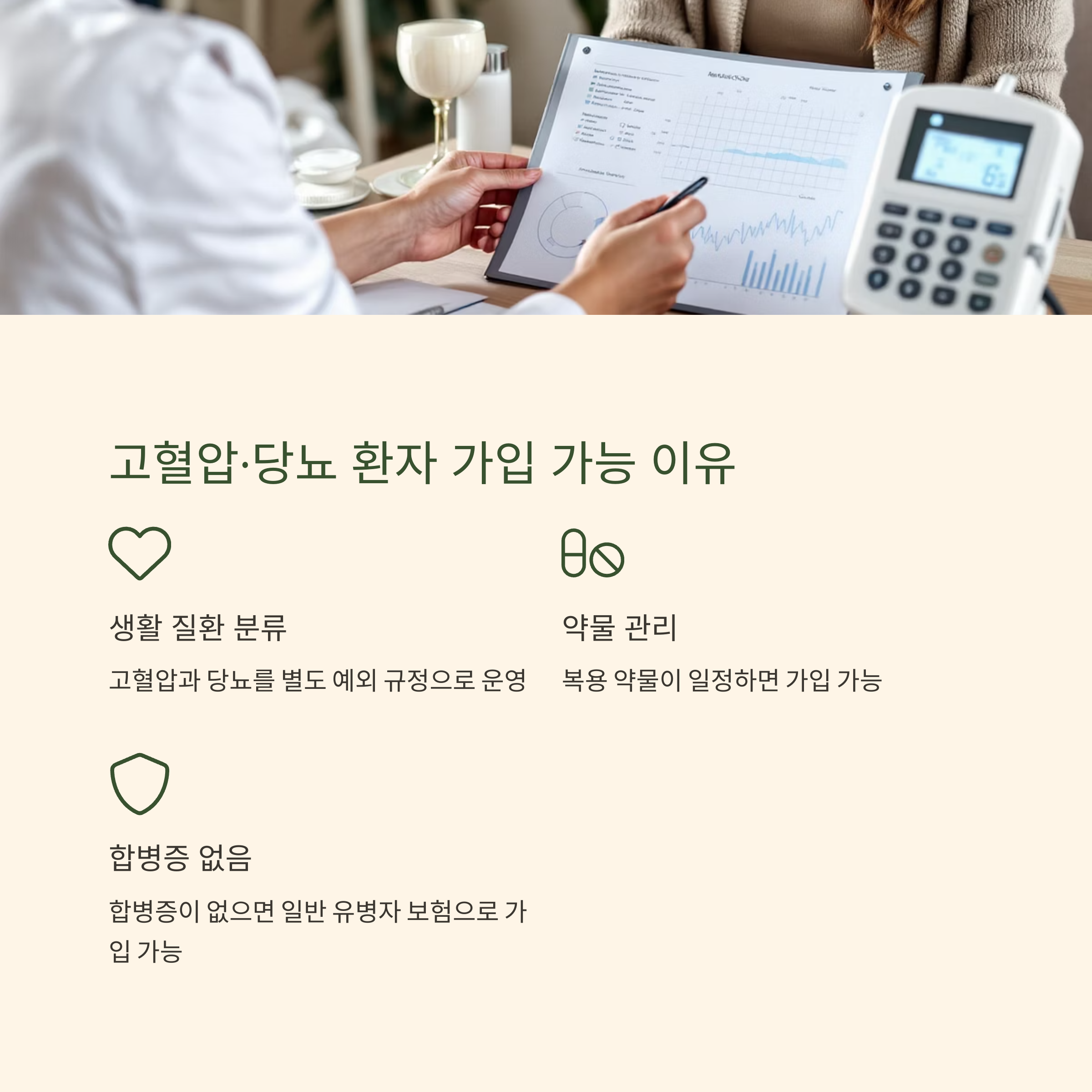 당뇨·고혈압 등 만성질환자도 조건만 맞는다면 가입이 충분히 가능합니다.
