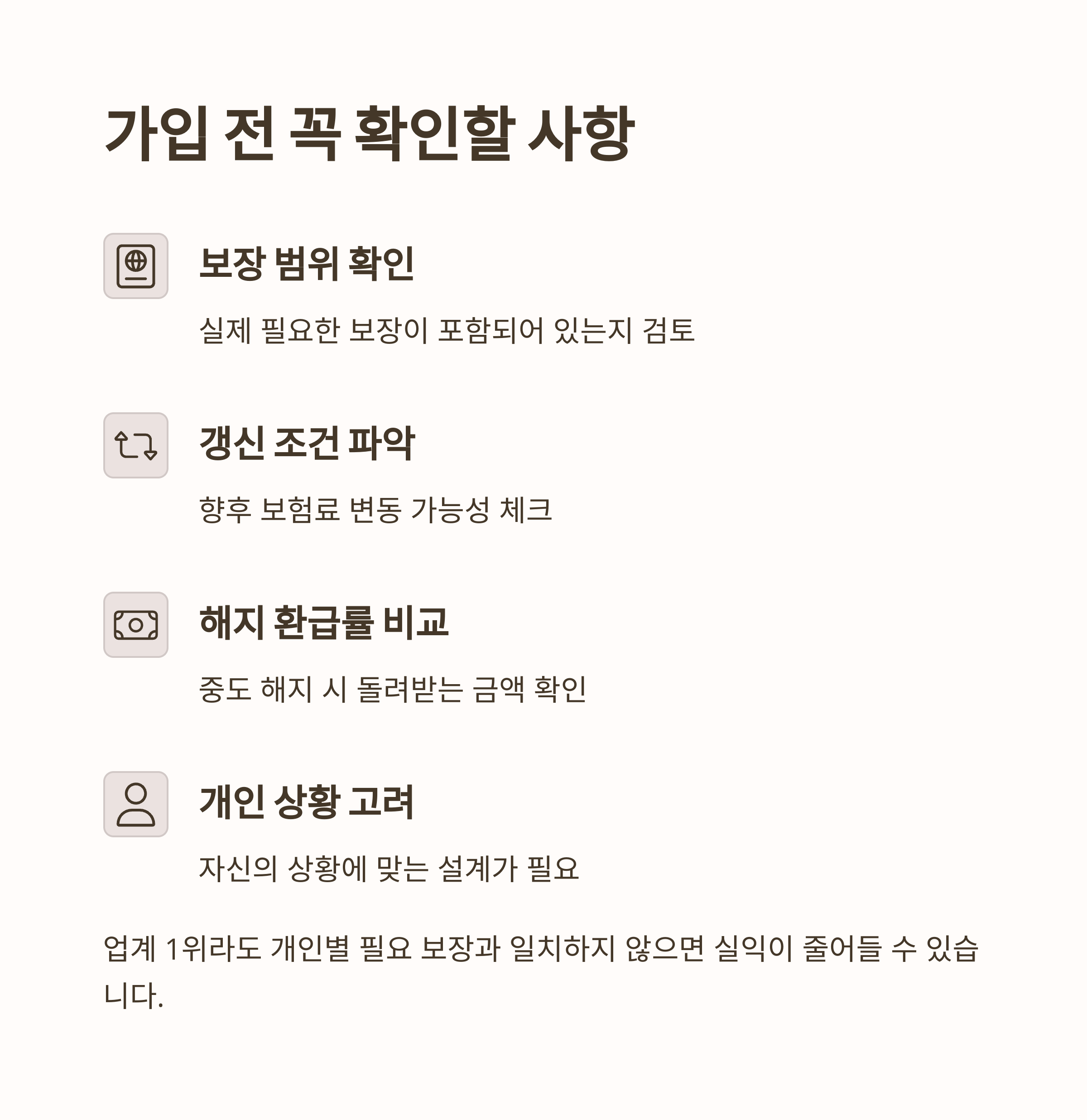 메리츠화재가 업계 1위라 해도 개인별 필요 보장과 일치하지 않는다면 실익은 줄어들 수 있습니다.