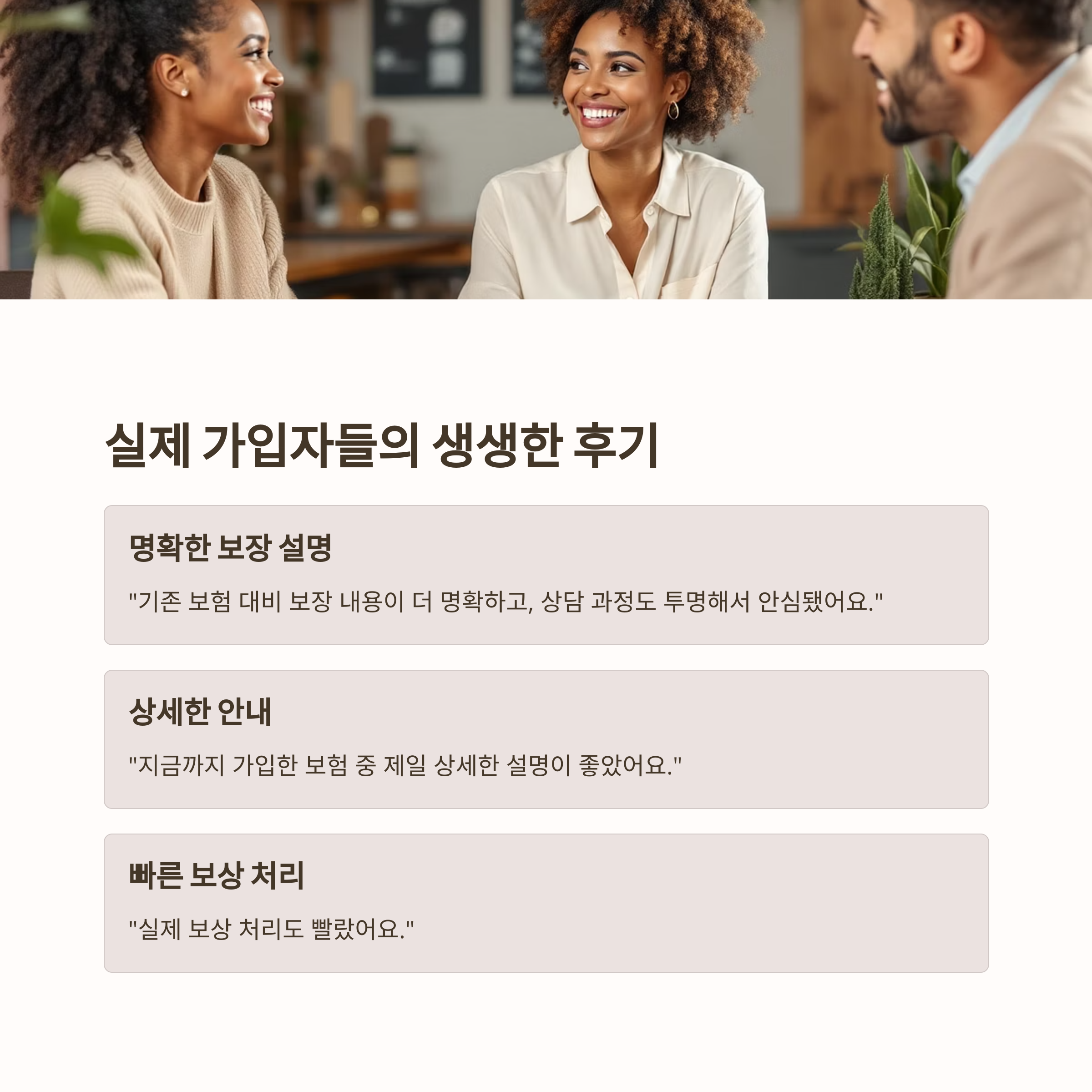 "지금까지 가입한 보험 중 제일 상세한 설명이 좋았고, 실제 보상 처리도 빨랐어요."