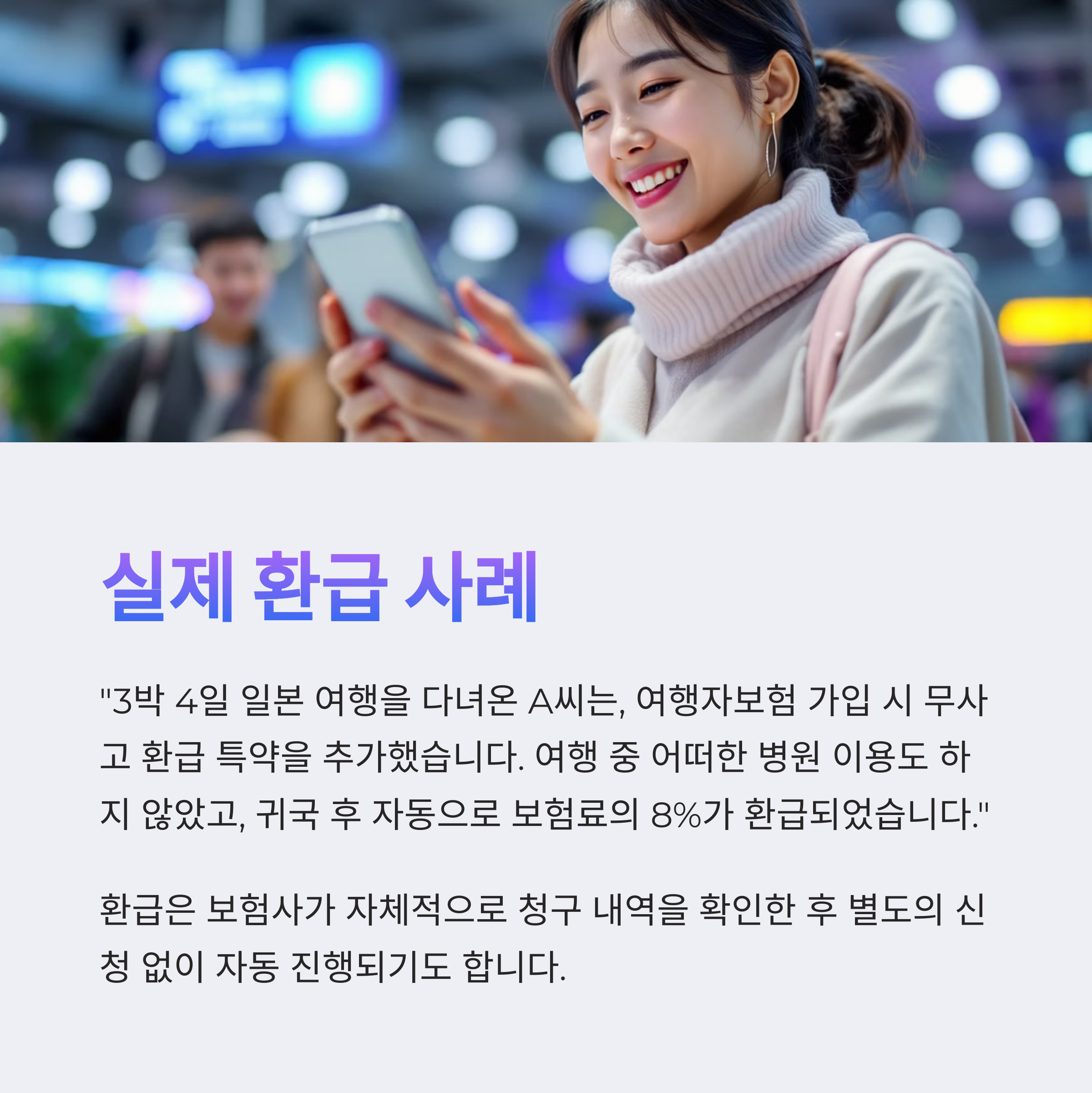 여행 중 어떠한 병원 이용도 하지 않았고, 귀국 후 자동으로 보험료의 8%가 환급되었습니다."