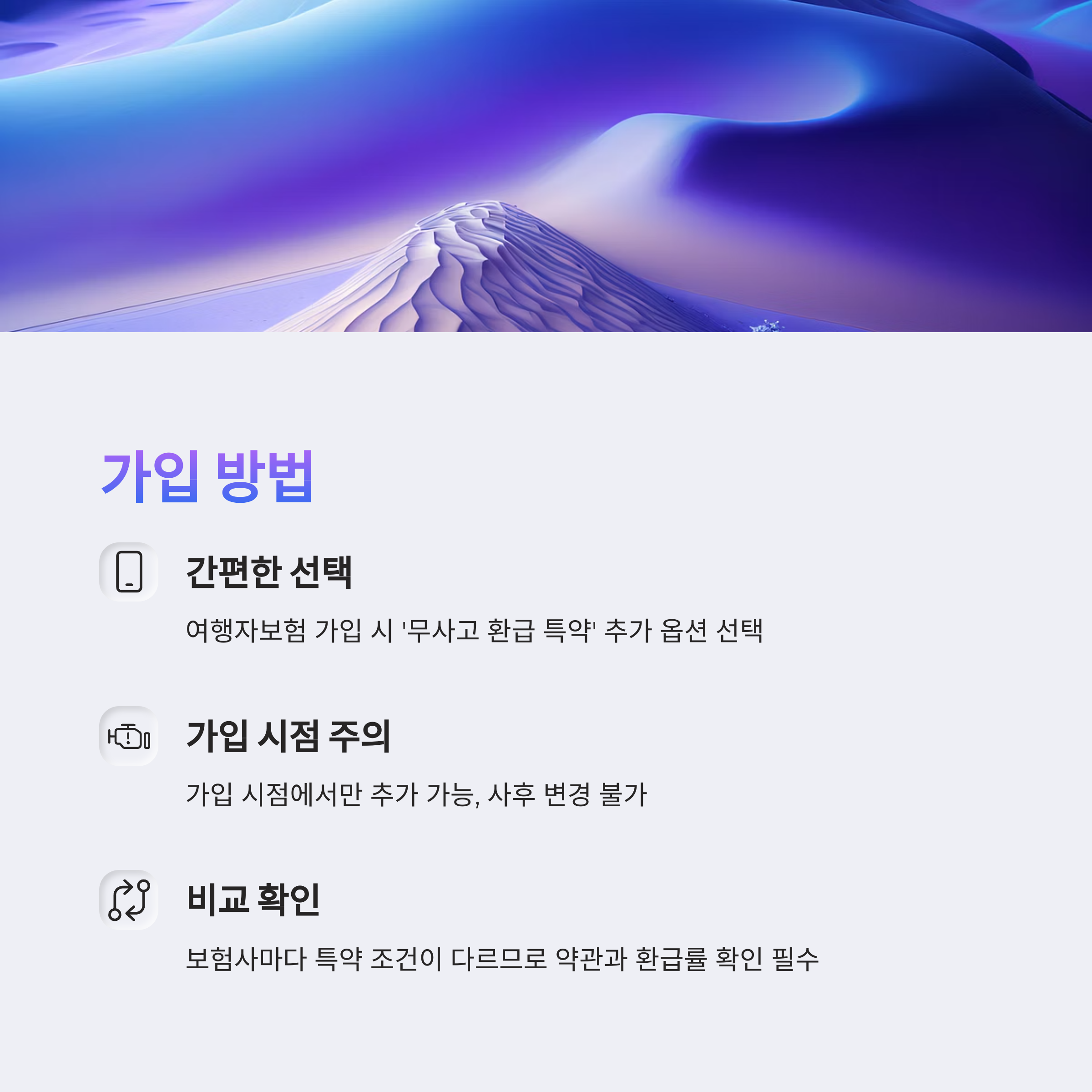 가입 방법은 간단합니다. 여행자보험을 선택할 때, '무사고 환급 특약'을 추가 옵션으로 선택하면 됩니다.