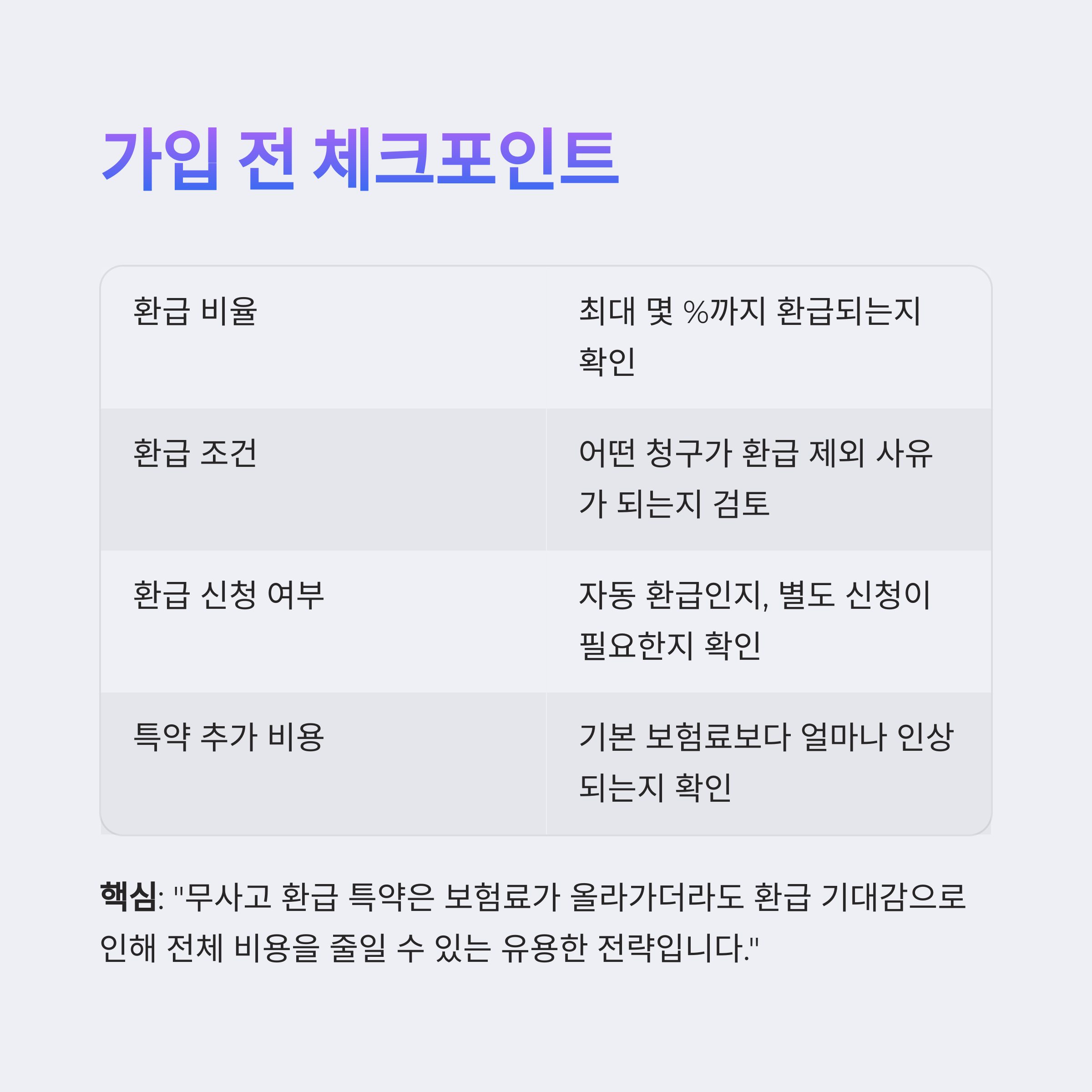 보험사마다 특약 조건이 상이하므로, 반드시 약관과 환급률, 환급 조건을 비교 확인해야 합니다.