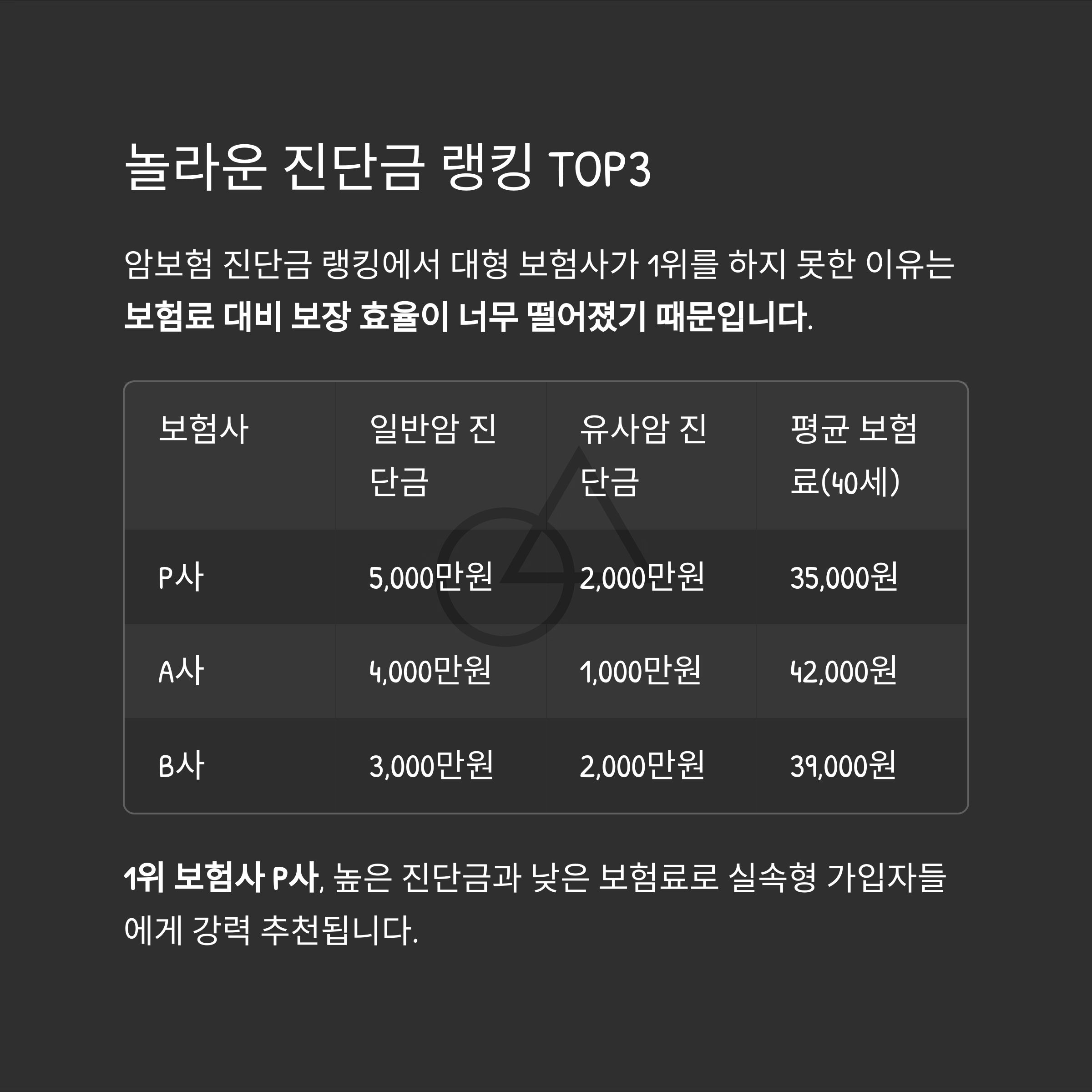1위 보험사 P사, 높은 진단금과 낮은 보험료로