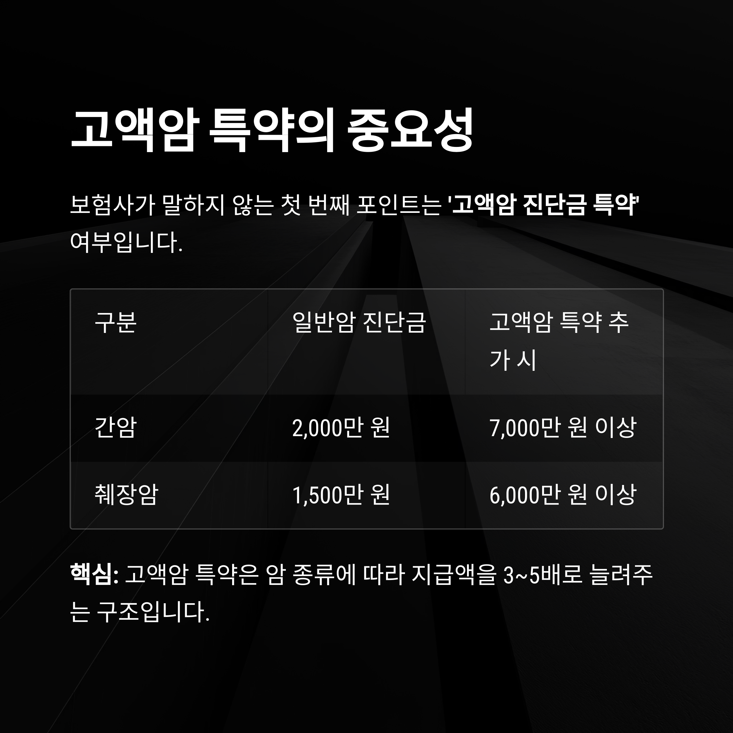 보험사 직원이 말하지 않는 첫 번째는 '고액암 진단금 특약' 여부입니다.