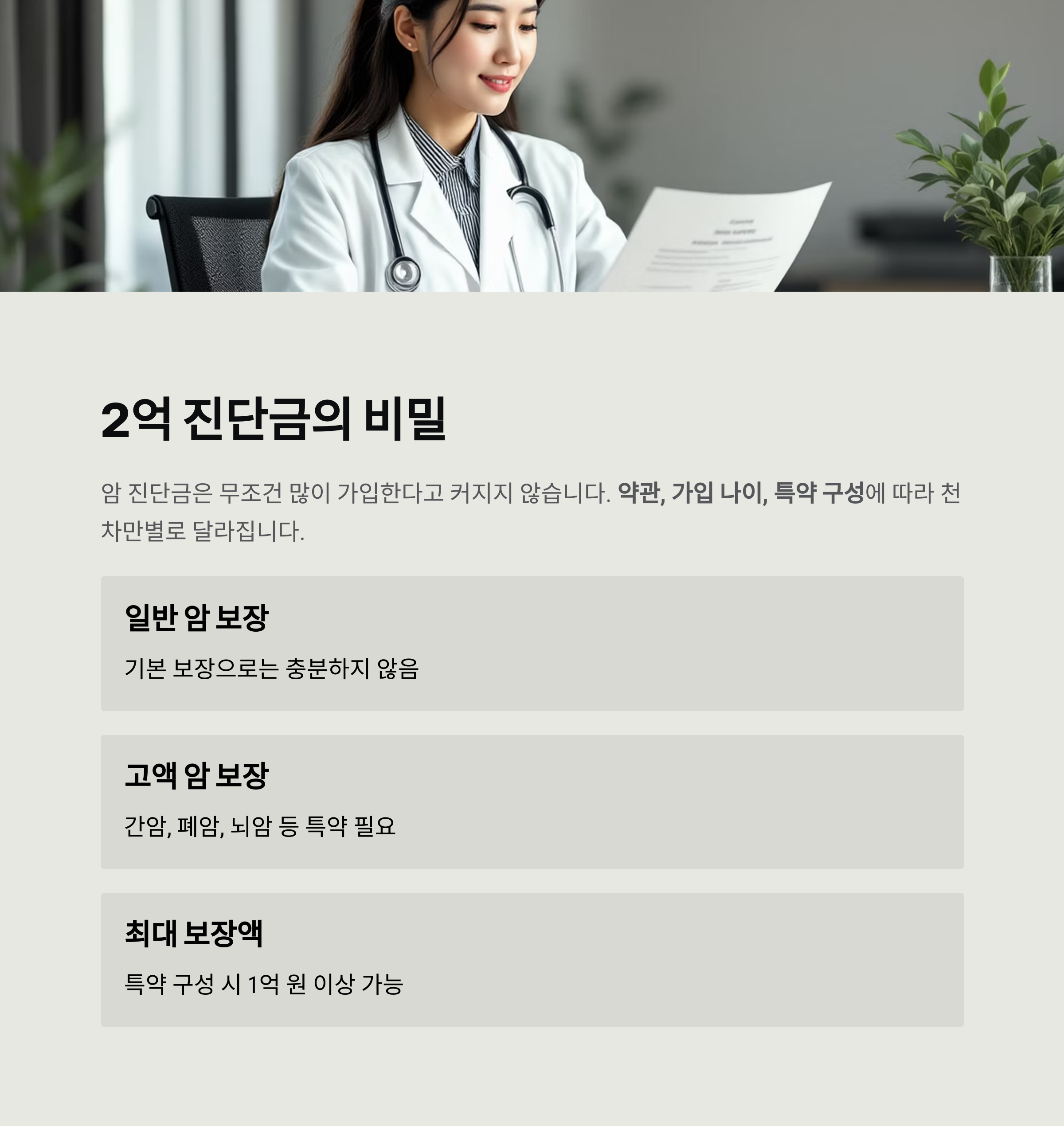 이 글은 암 진단 시 최대 2억 원까지 보장받을 수 있는 조건과