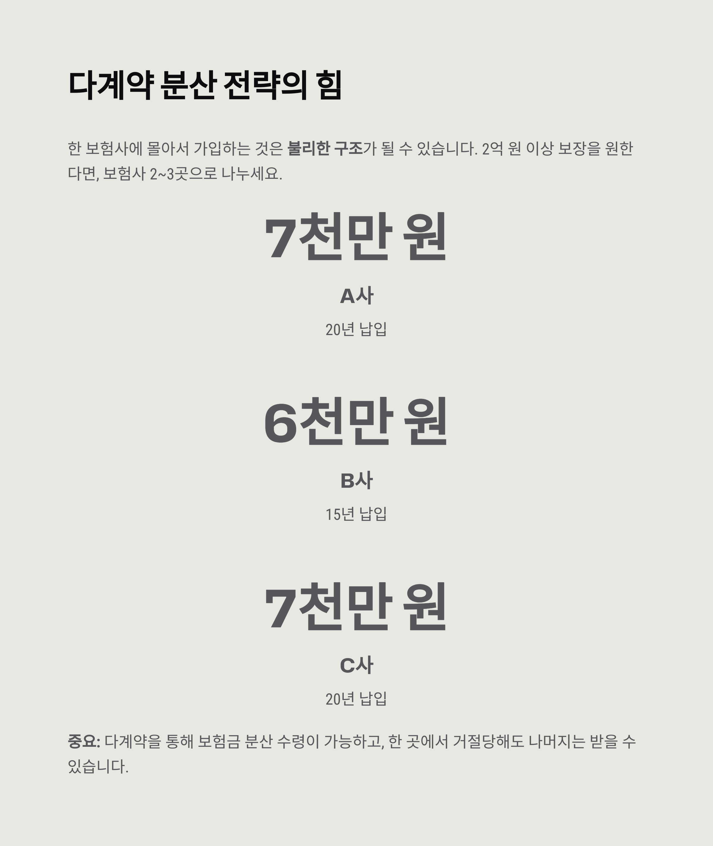 2억 원 이상 보장을 원한다면, 보험사 2~3곳으로 나누는 방식이 중요합니다.