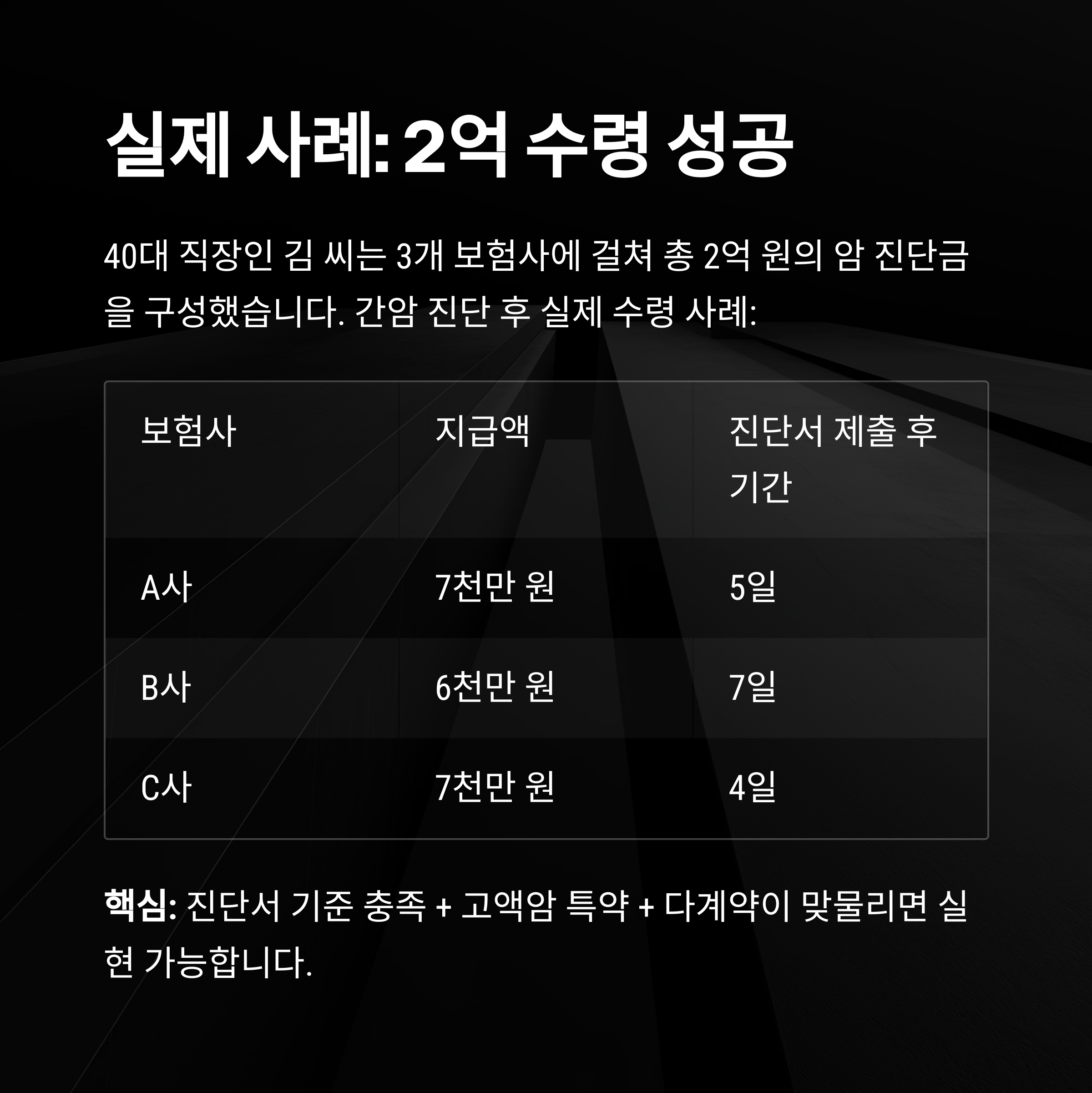핵심: 진단서 기준 충족 + 고액암 특약 + 다계약이 맞물리면 실현 가능