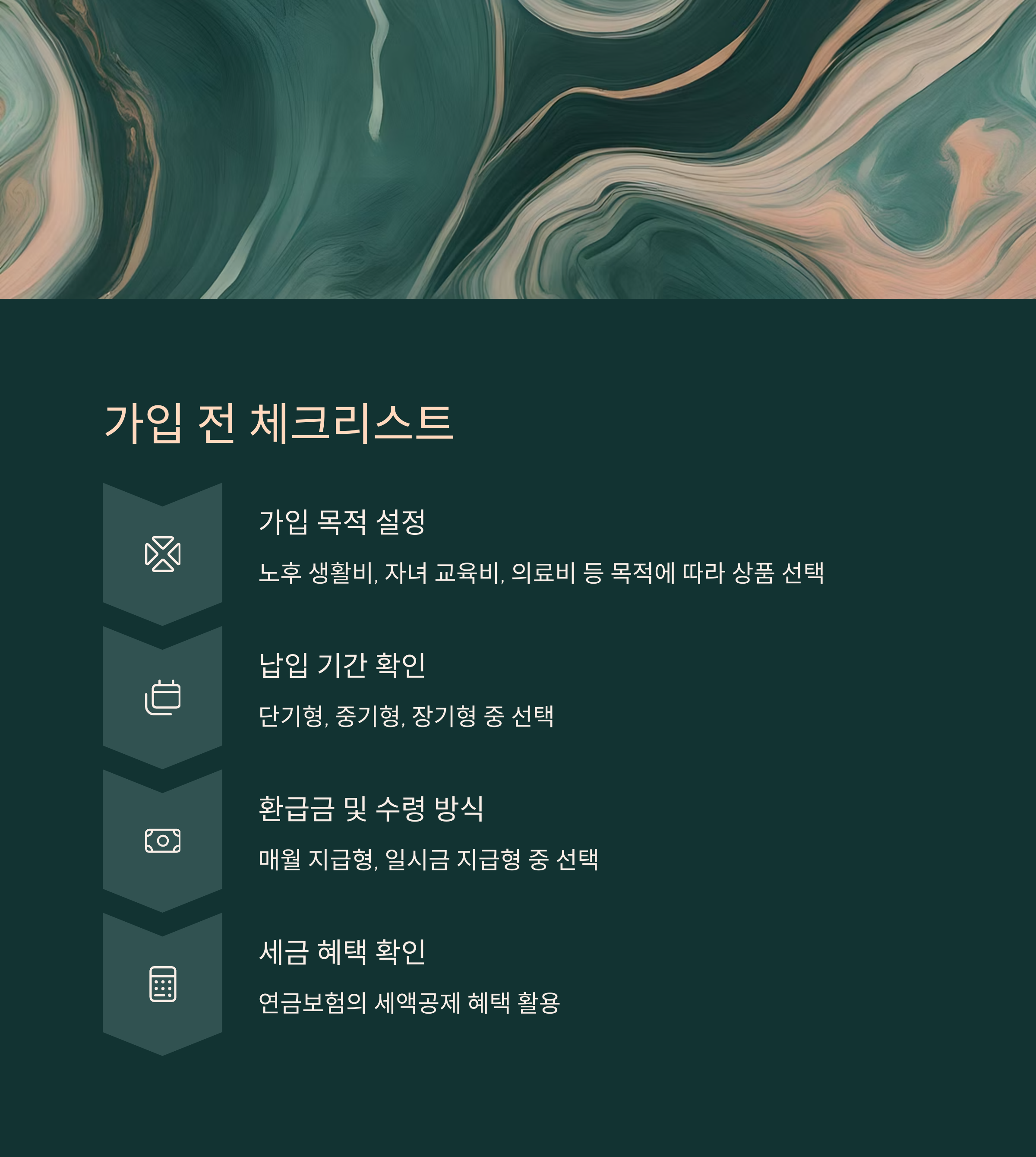 연금보험 가입 시 확인해야 할 사항은 다음과 같습니다: