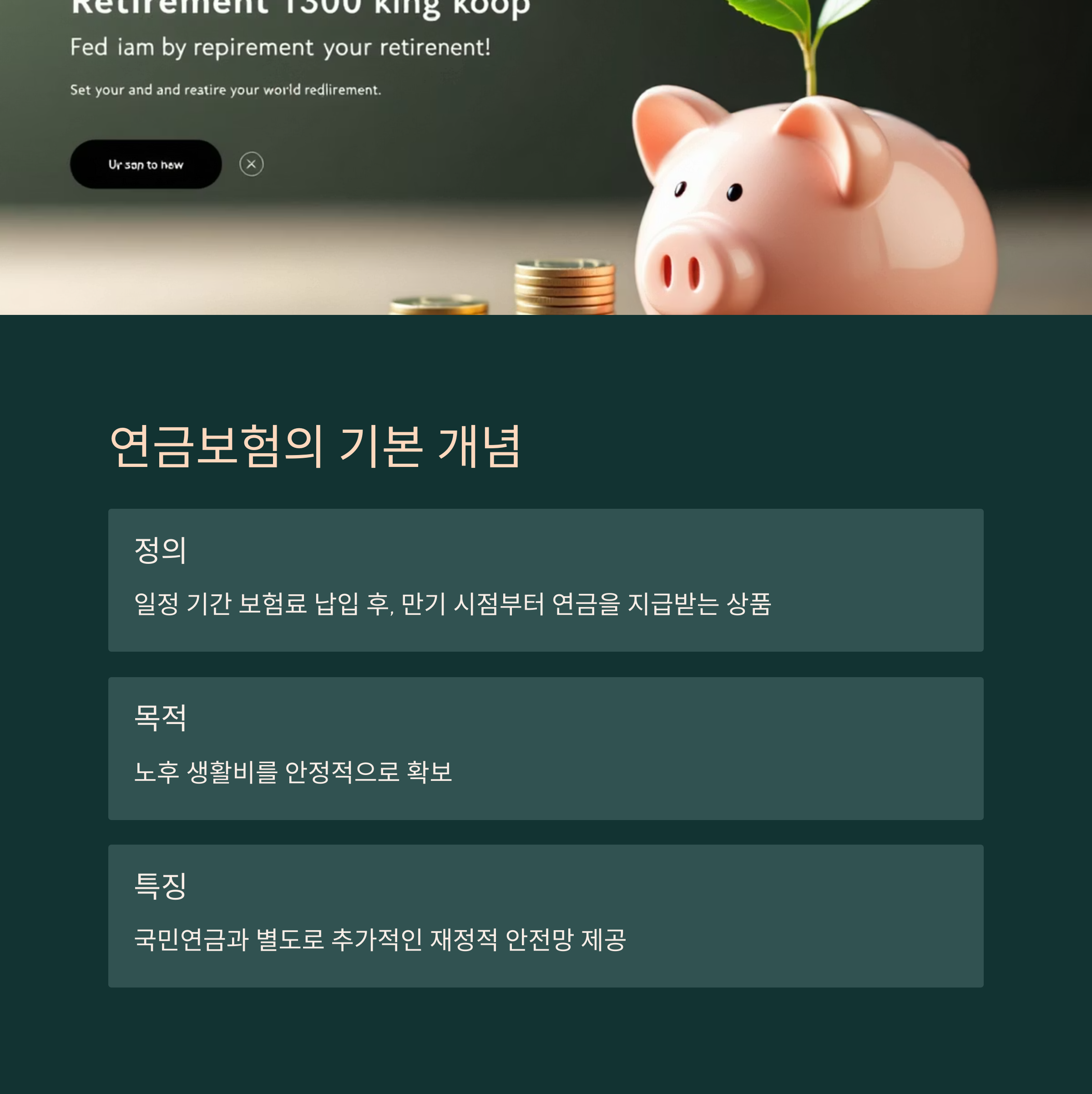 연금 보험이란 무엇인가요? 기본 개념과 필요성연금 보험은 미래의 안정된 노후 생활을 위해 현재 일정 금액을 불입하고,나중에 연금 형태로 지급받는 금융 상품입니다.노동 소득이 줄어드는