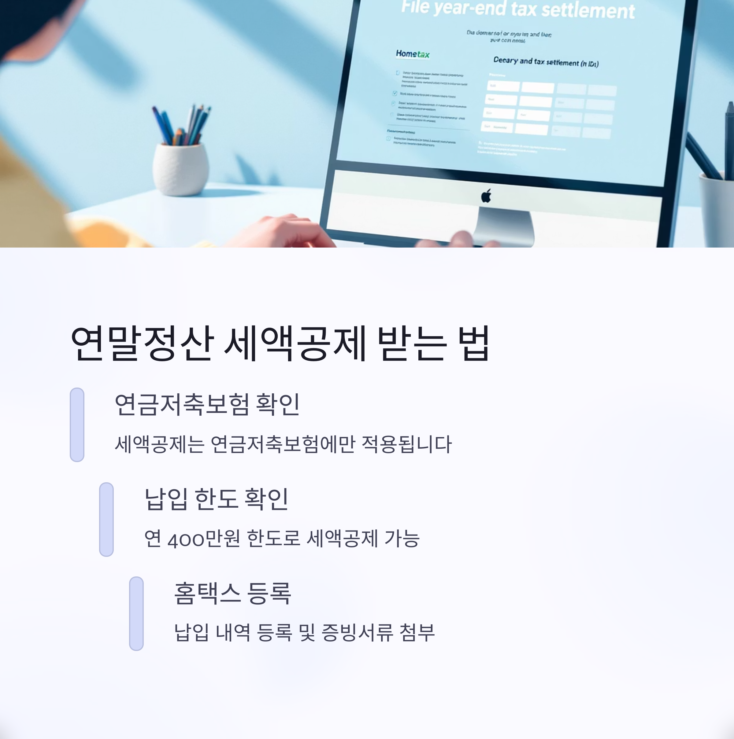 연말정산 시 국세청 홈택스에 연금보험 납입 내역을 등록하고, 증빙서류를 첨부하면 공제가 가능합니다