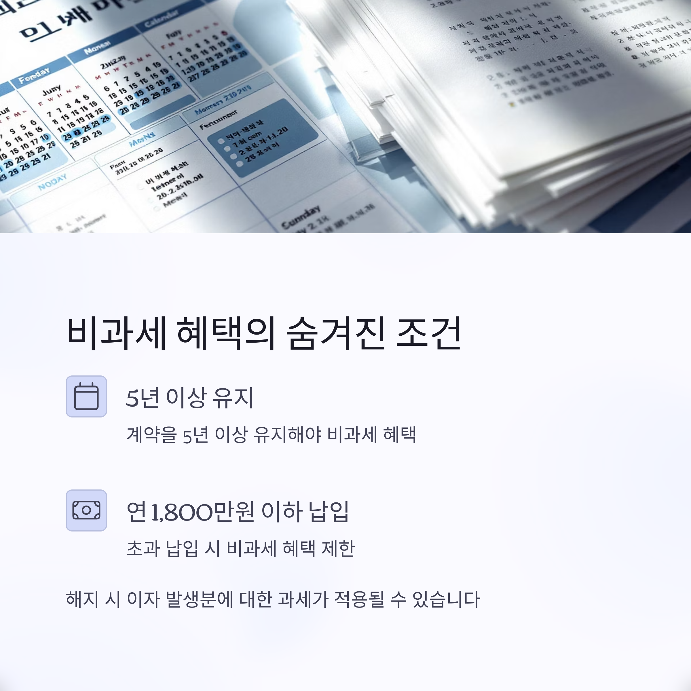 하지만 가입 후 5년 이상 유지 조건과 연 1,800만 원 이하 납입 기준을 충족해야만 비과세 혜택이 주어집니다