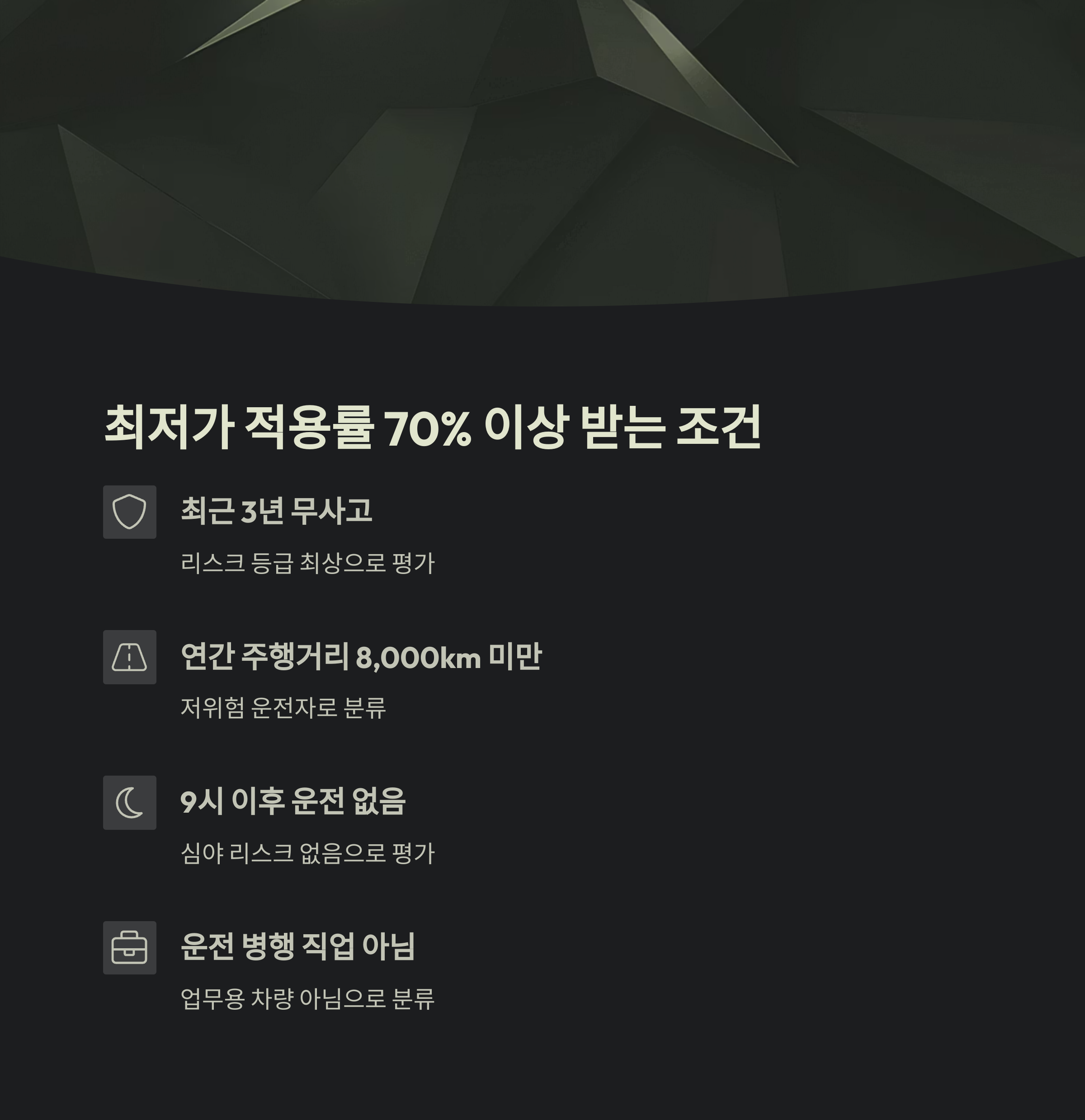 | 연간 주행거리 8,000km 미만 | 저위험 운전자 |