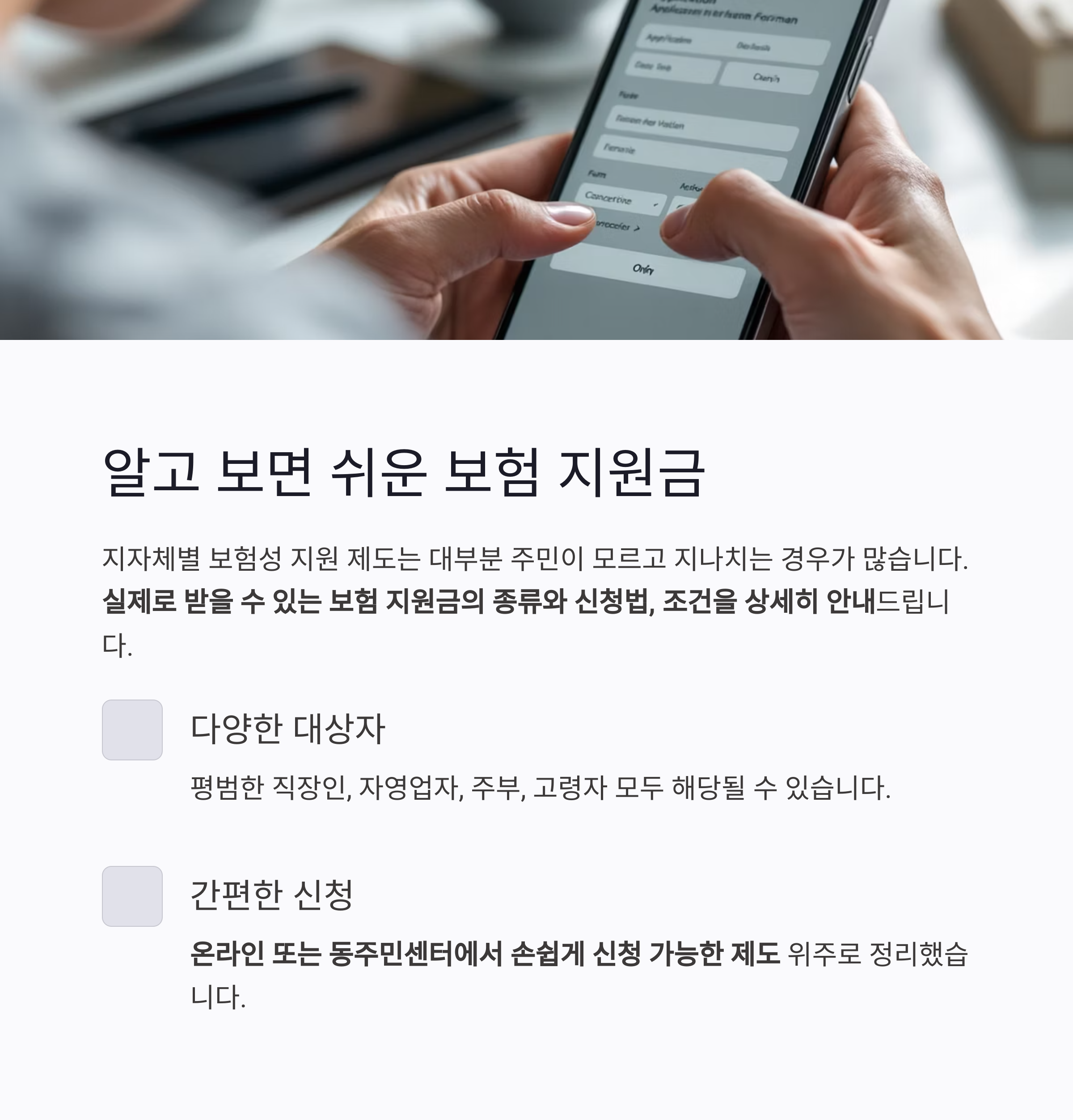 지자체별로 제공하는 보험성 지원 제도는 주민 대부분이 모르고 지나치는 경우가 많습니다