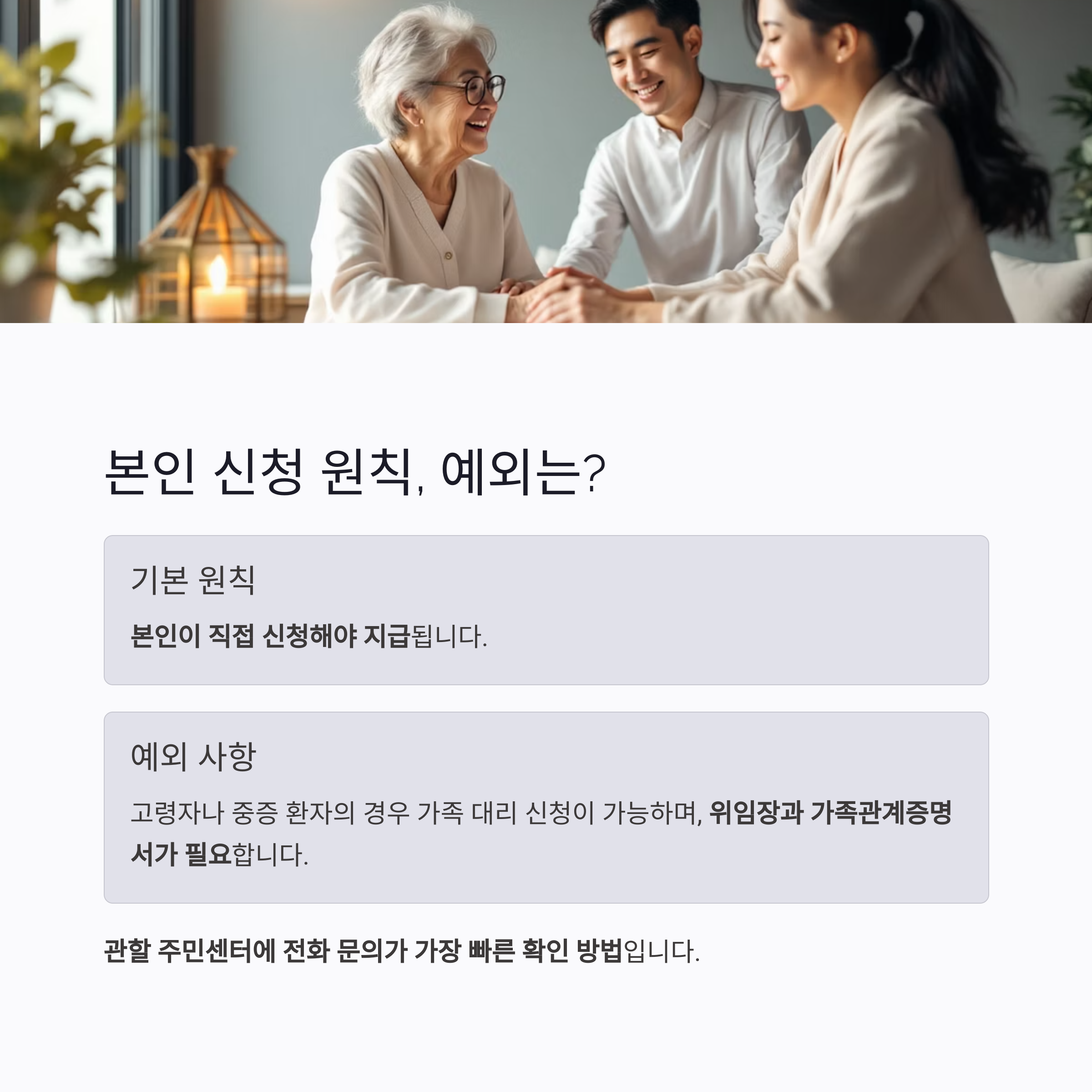 다만 고령자나 중증 환자의 경우 가족 대리 신청이 가능하며, 위임장과 가족관계증명서가 필요합니다