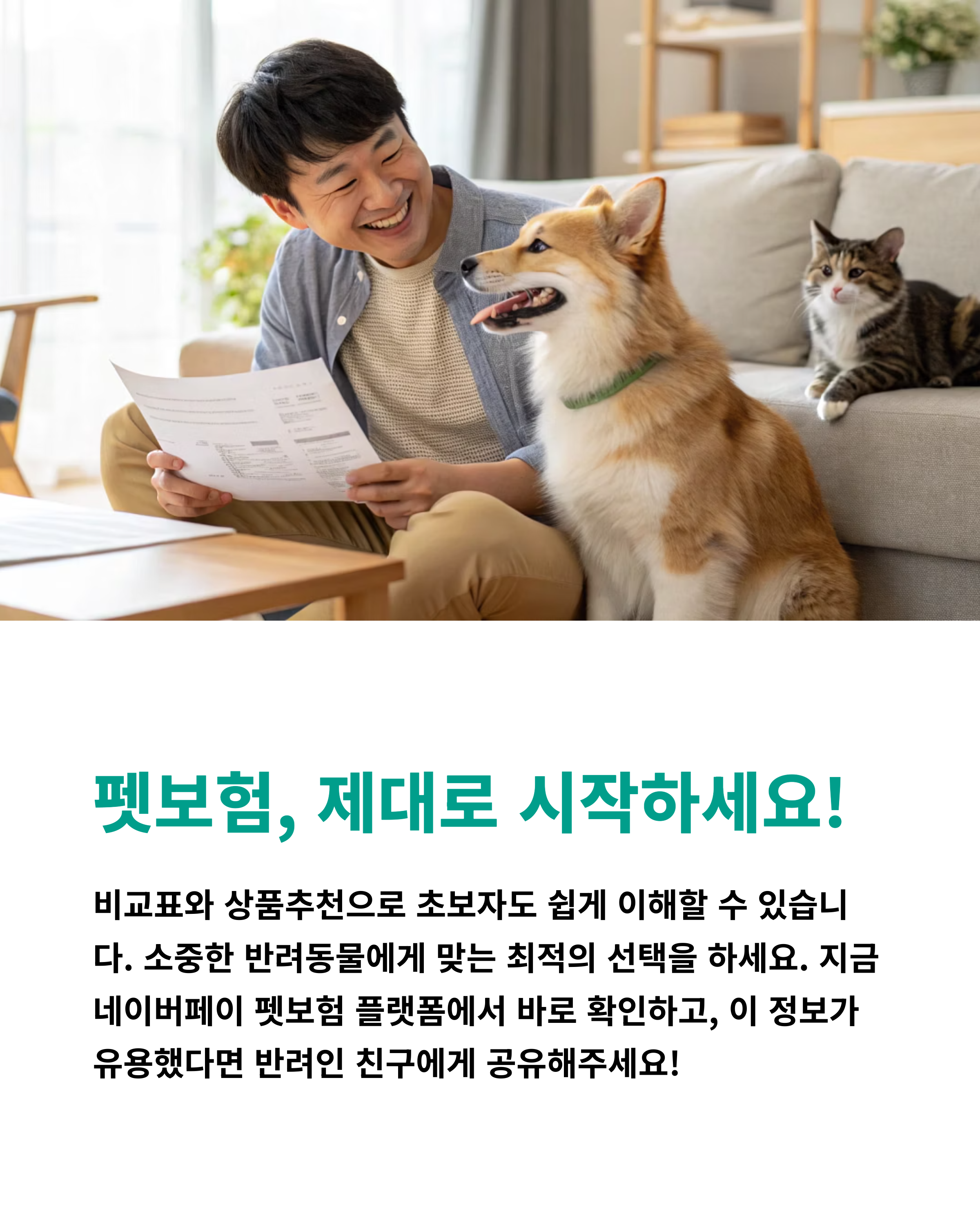 펫보험은 단순한 보장이 아닌, 우리 아이를 위한 사랑과 책임의 표현입니다. 처음에는 다양한 용어와 상품들에 혼란스러울 수 있지만, 비교 플랫폼을 활용해 정보를 모으고, 견종별 특성을 고려한 상품을 선택한다면 충분히 좋은 결정을 내릴 수 있습니다. 반려동물은 말을 할 수 없지만, 보호자는 그들의 아픔을 알아차리고 미리 준비하는 역할을 해야 합니다. 이번 글이 여러분이 펫보험을 선택하는 데 조금이나마 도움이 되기를 바랍니다.