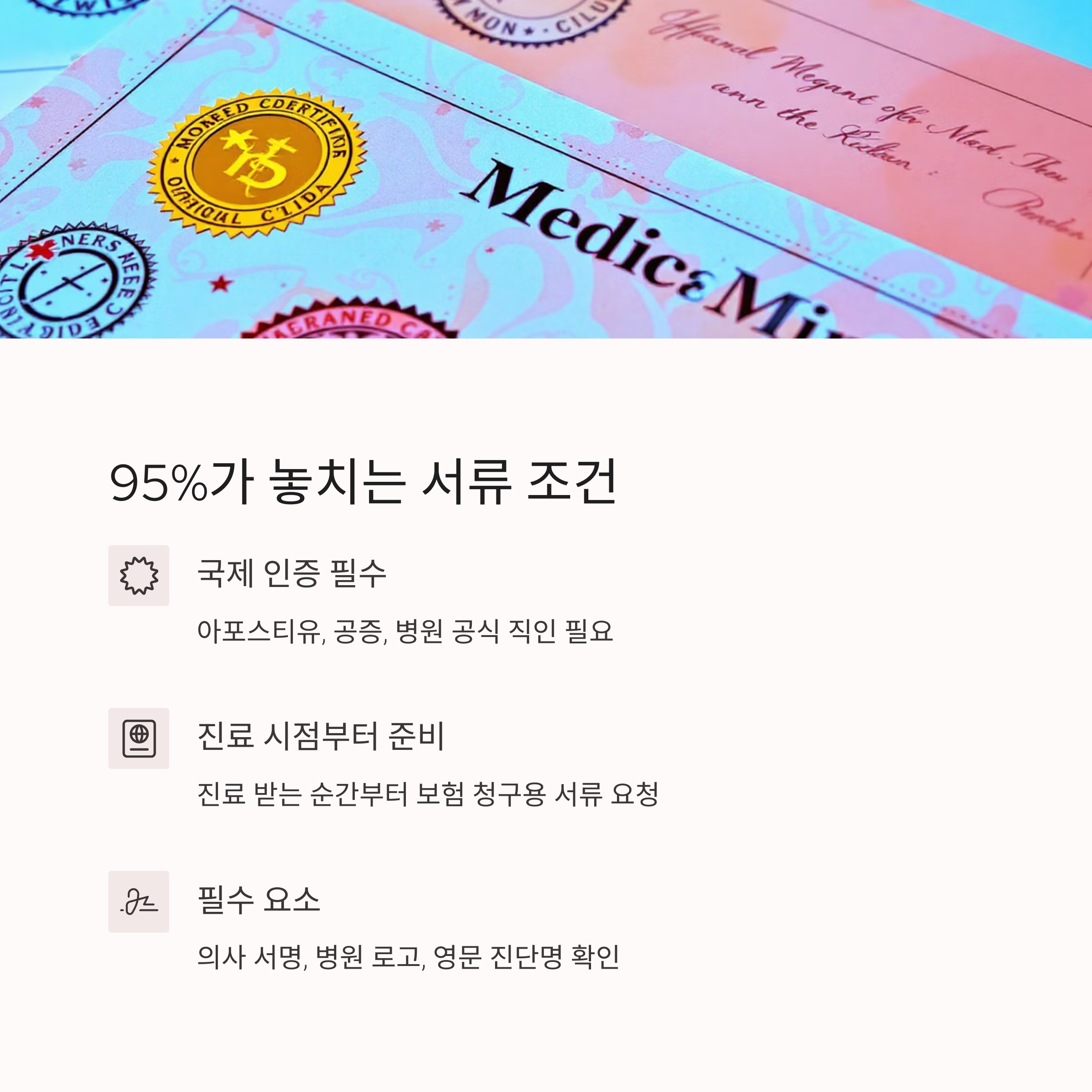 국제 인증(예: 아포스티유, 공증, 병원 공식 직인) 없이는 거절되는 사례가 많습니다.