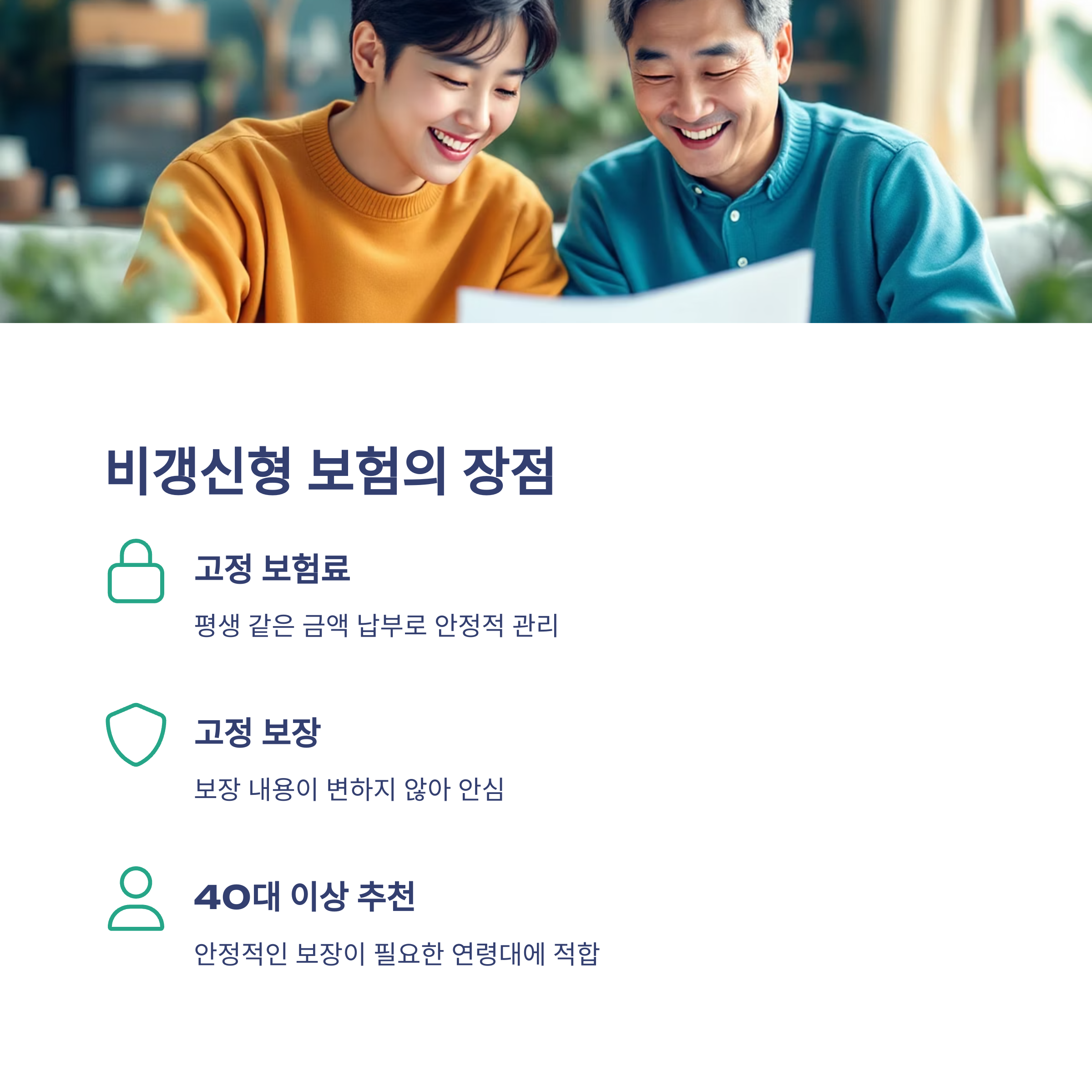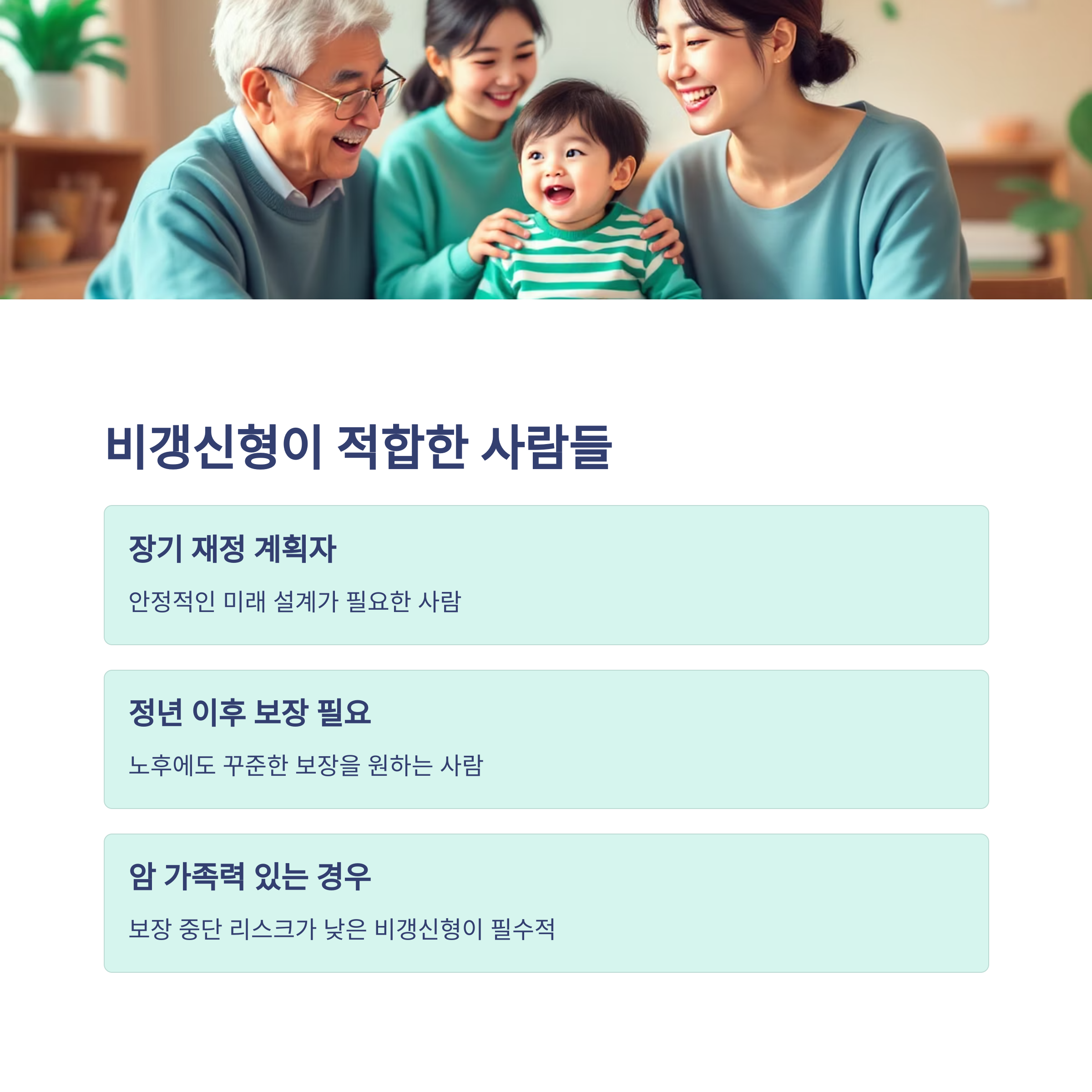 반면, 비갱신형은 장기 보장이 필요한 가입자에게 안정적 대안이 됩니다