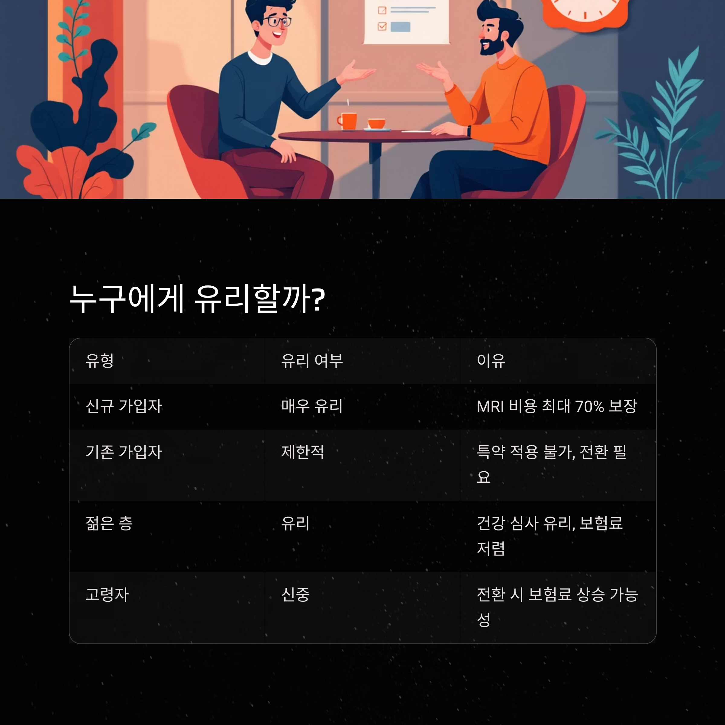 | 신규 가입자 | 매우 유리 | MRI 비용 최대 70% 보장 |