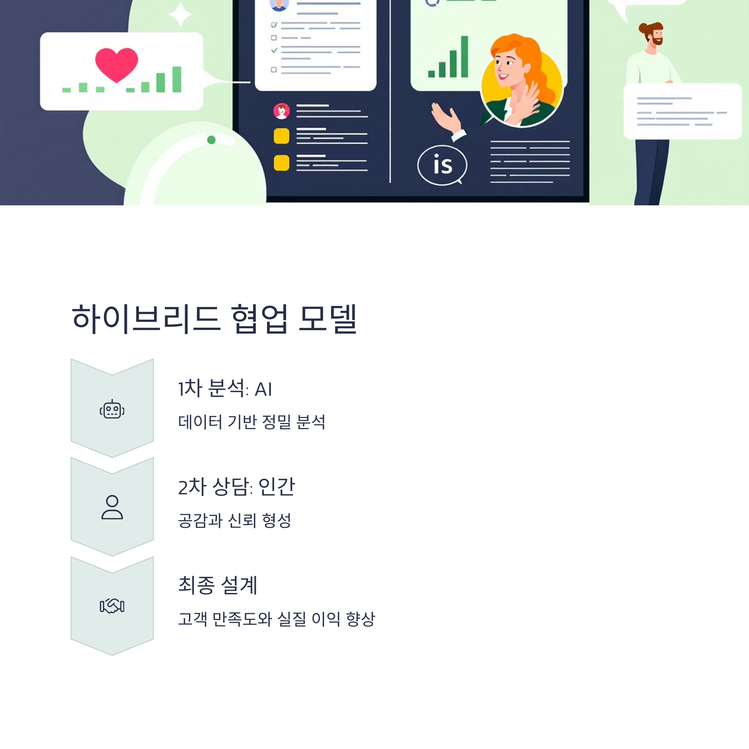 AI는 실수 없는 분석과 빠른 처리, 인간은 고충을 듣고 정서적 신뢰를 형성하는 역할을 맡는 구조입니다.